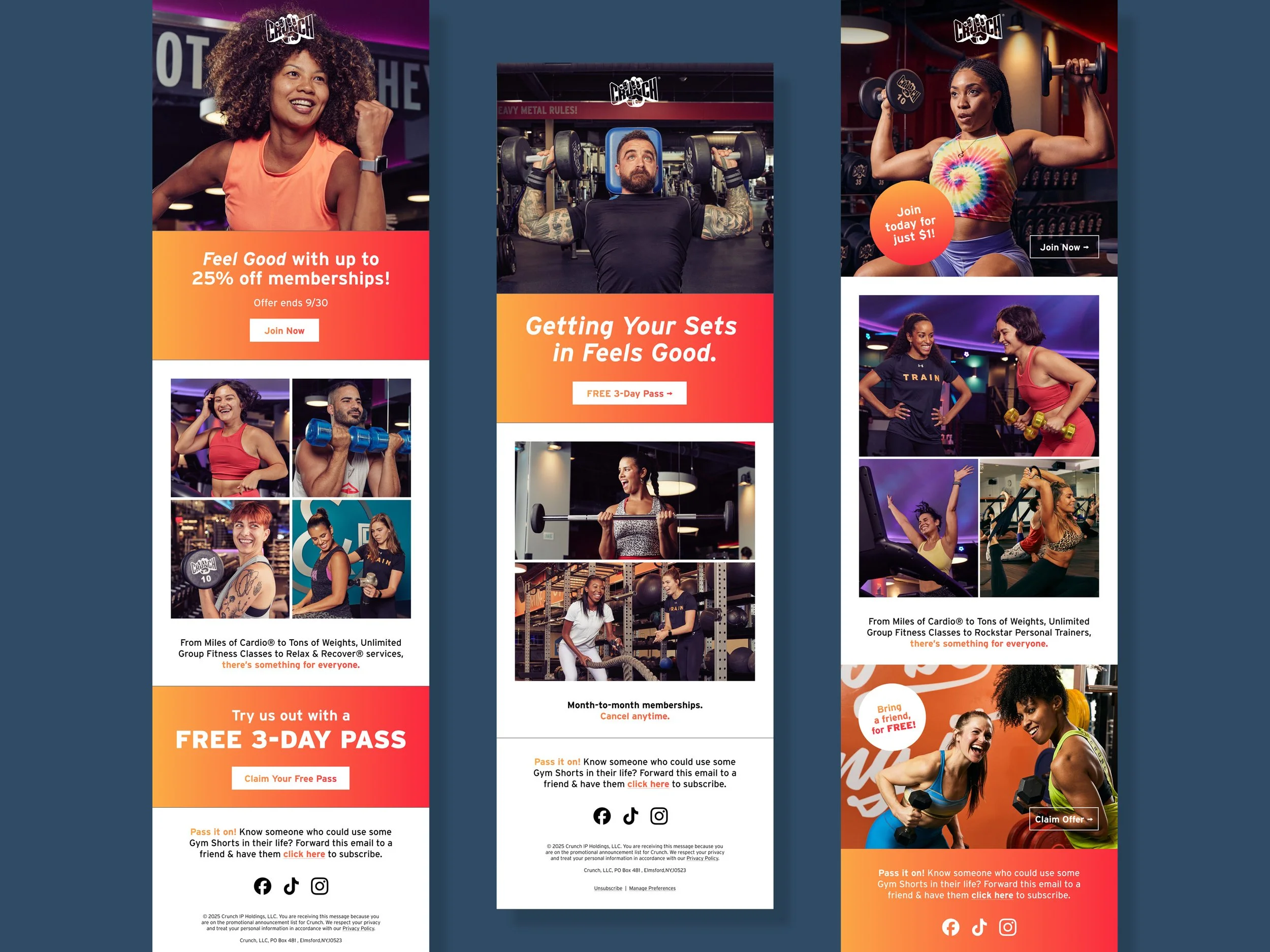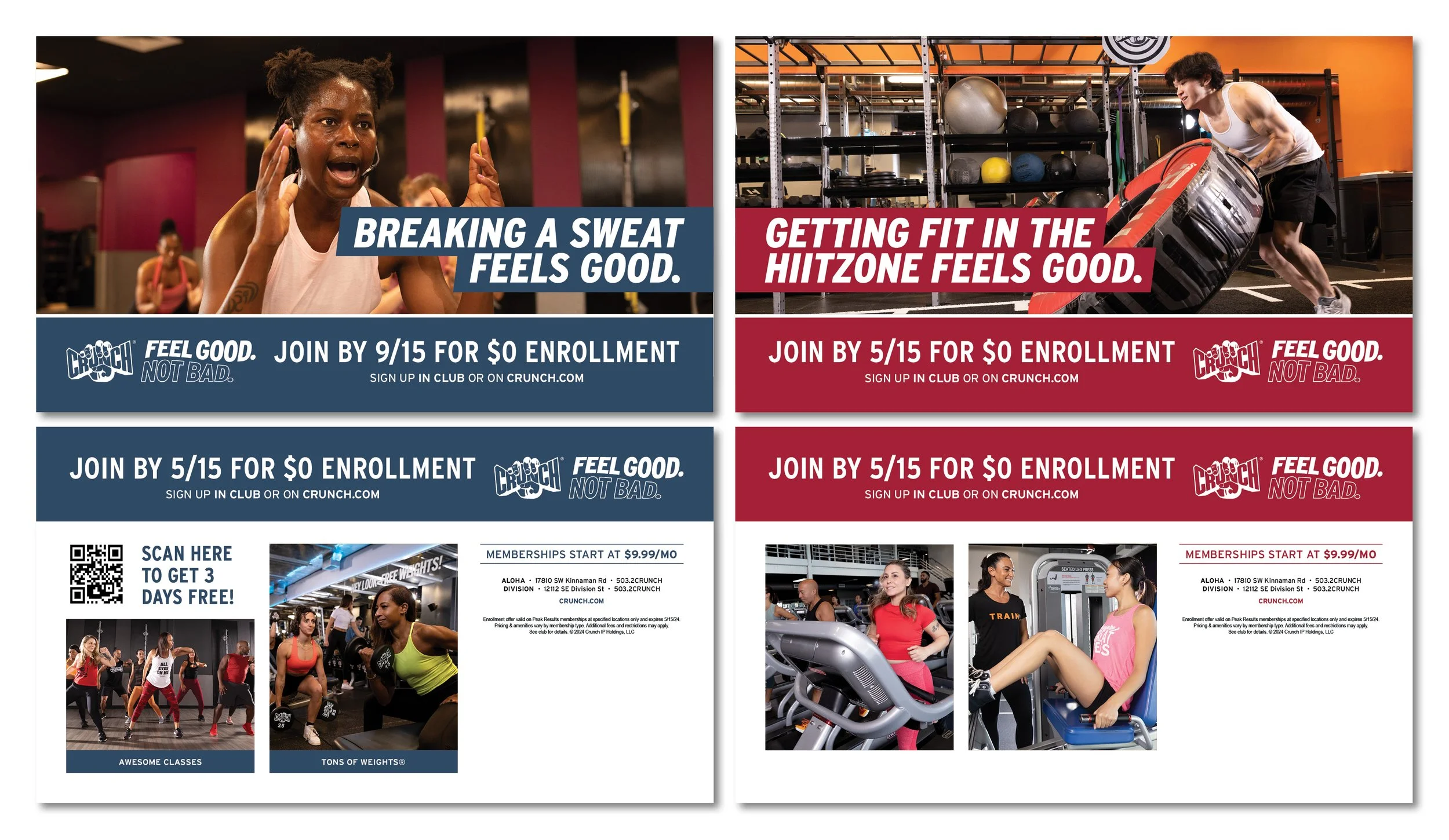 A collection of work I created for Crunch Fitness’ Feel The Good campaign, which launched in January 2024. This campaign echoes Crunch Fitness’ brand purpose: Everyone deserves to feel good, and Crunch is where you can feel it! Campaign includes TV spots, direct mail pieces, social assets, OOH advertising, club signage, and email templates, and is refreshed quarterly with new photography and lines.