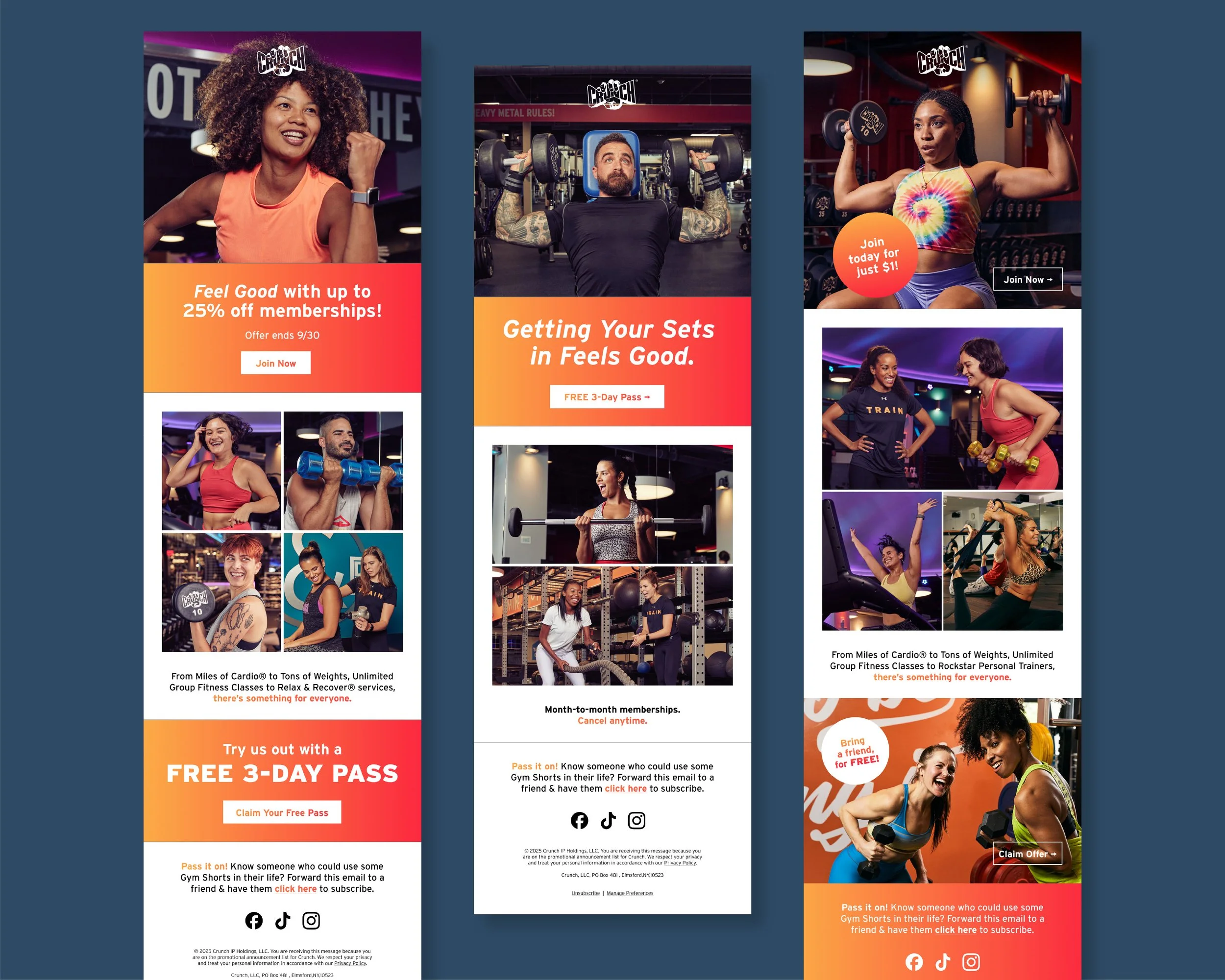 Over multiple campaign cycles, I partnered in evolving Crunch’s campaign platform toward a more refined and scalable visual system. Each campaign iteration introduced improvements in hierarchy, photography direction, and modular layout structures to support a consistent global rollout. The progression below highlights how campaign language and visual identity developed over time.