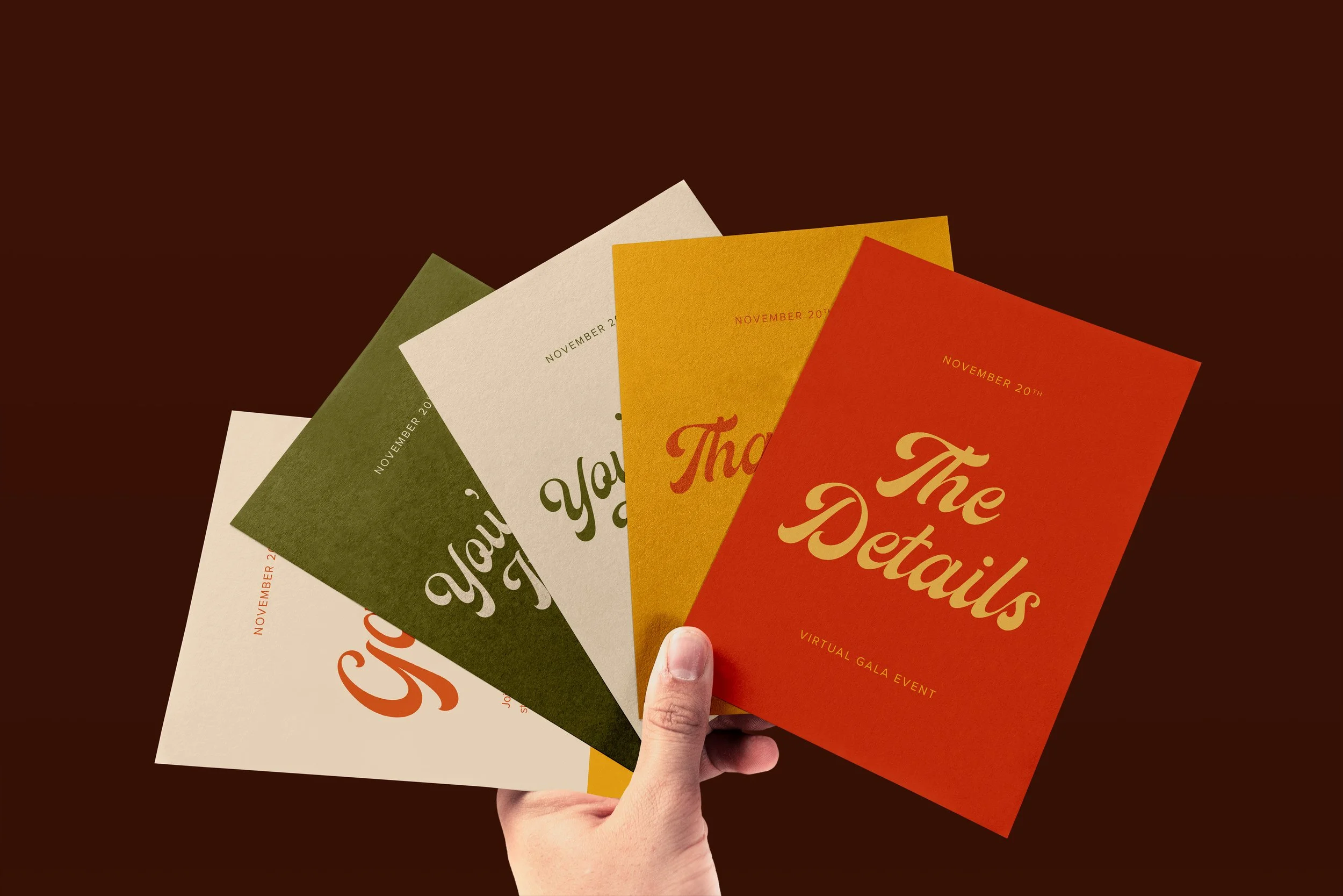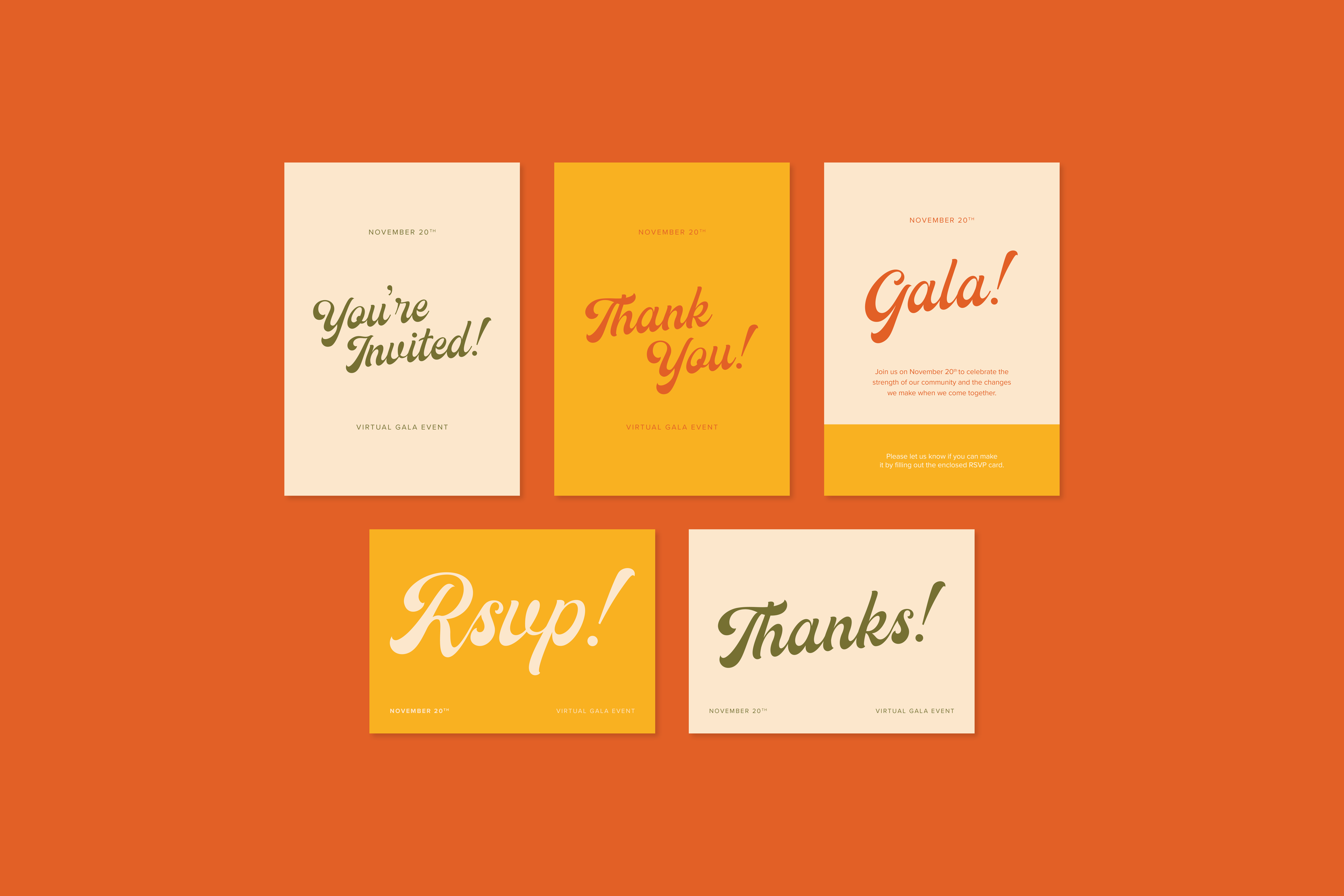 Invitation materials - including the introductory invitation, RSVP card, and thank you note - for Larchmont Friends of the Family - a local non-profit hosting a virtual fundraising gala amid the Covid-19 pandemic to raise funds for the community. Using bright, earthy colors and bold type, these invitation materials aim to encourage attendance and foster community spirit.