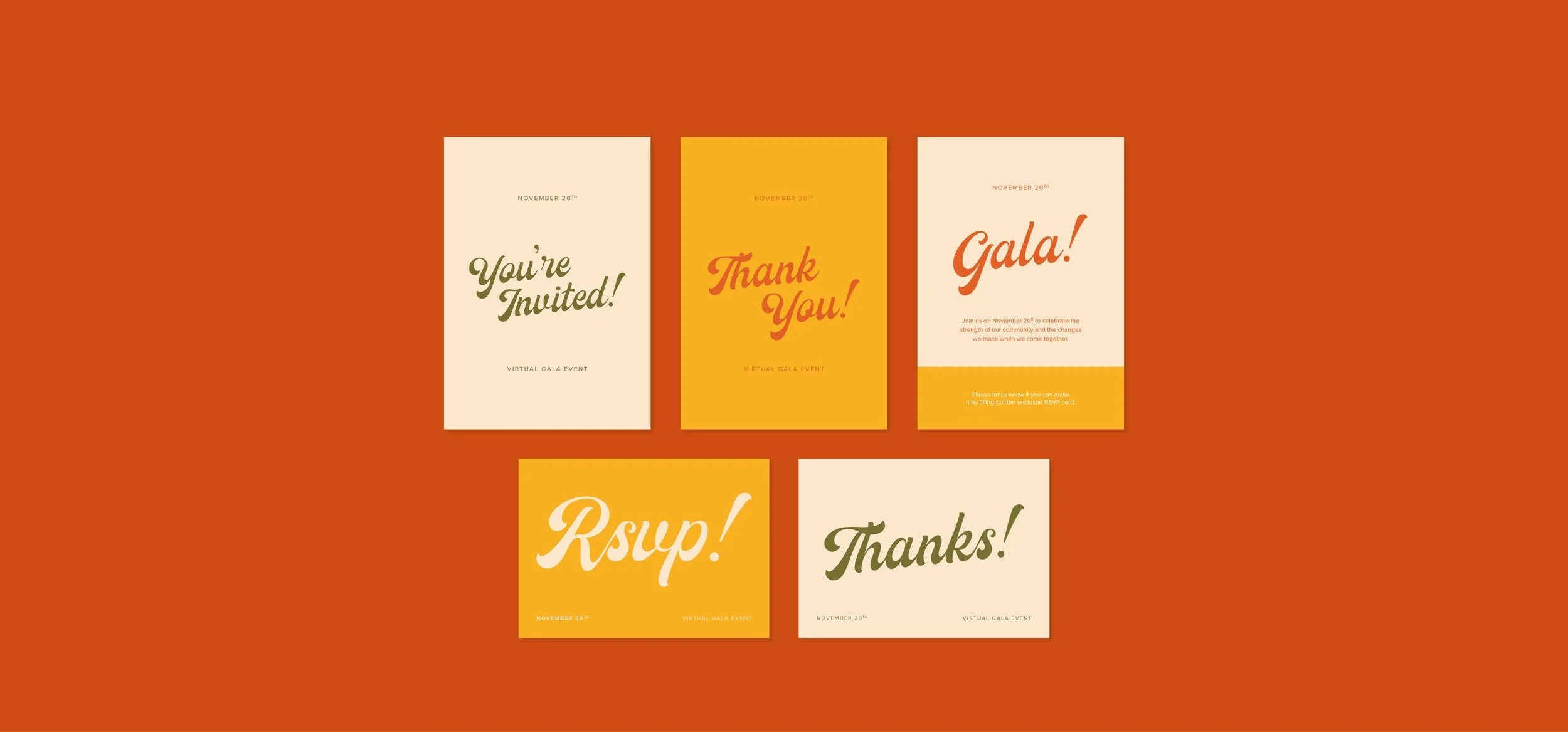 Invitation materials - including the introductory invitation, RSVP card, and thank you note - for Larchmont Friends of the Family - a local non-profit hosting a virtual fundraising gala amid the Covid-19 pandemic to raise funds for the community. Using bright, earthy colors and bold type, these invitation materials aim to encourage attendance and foster community spirit.